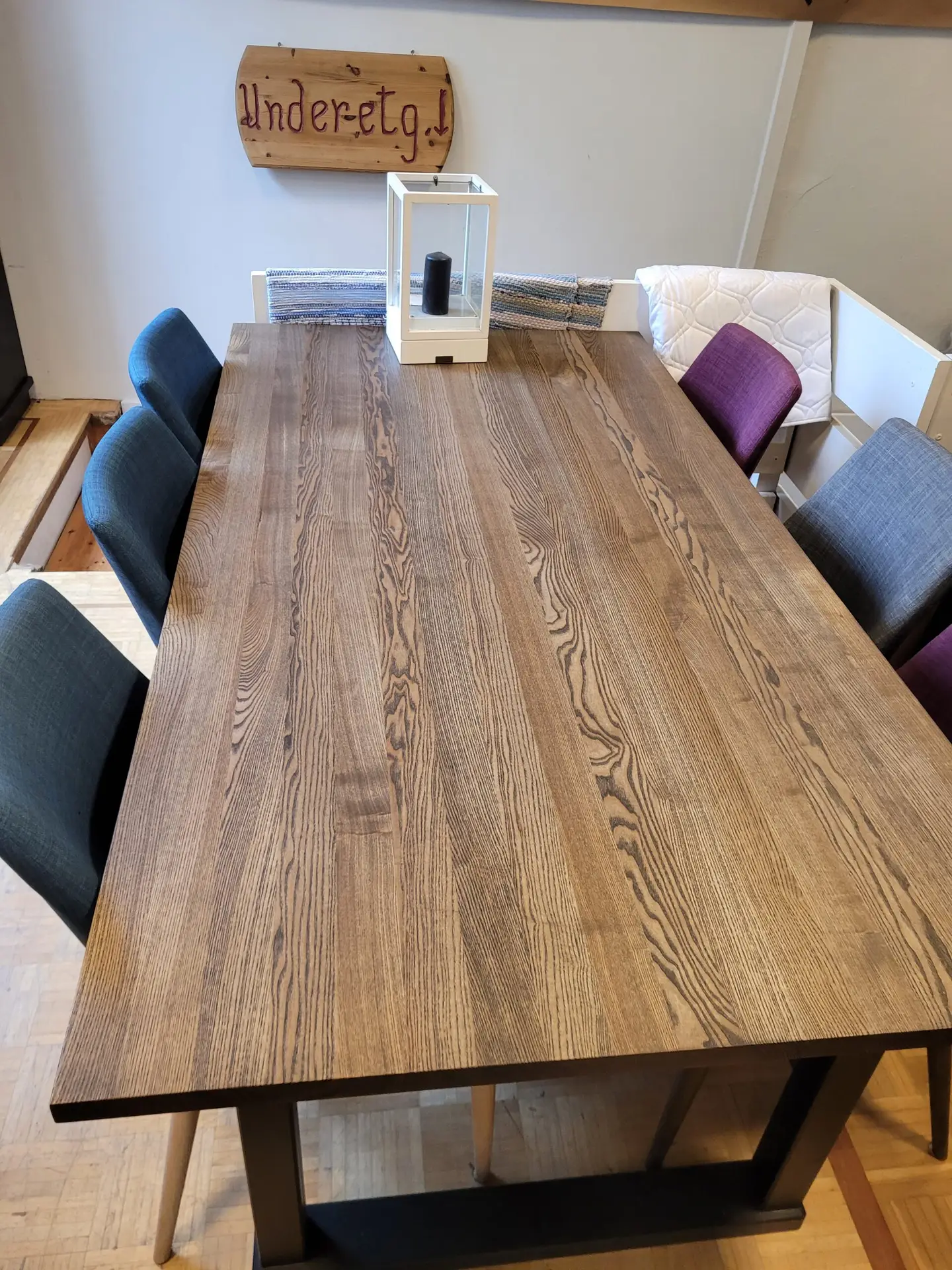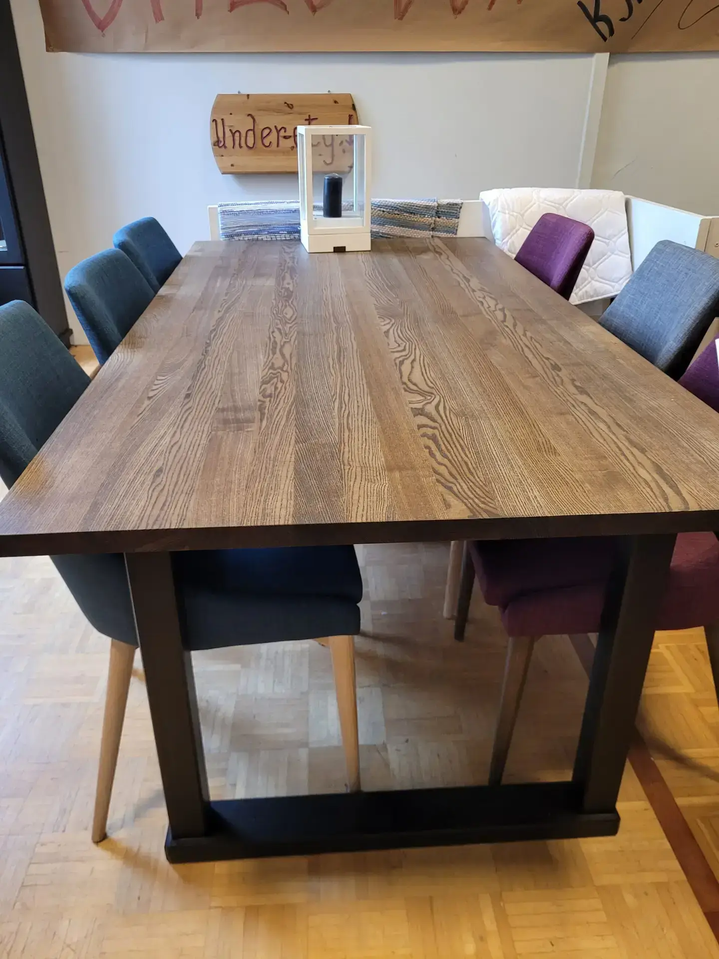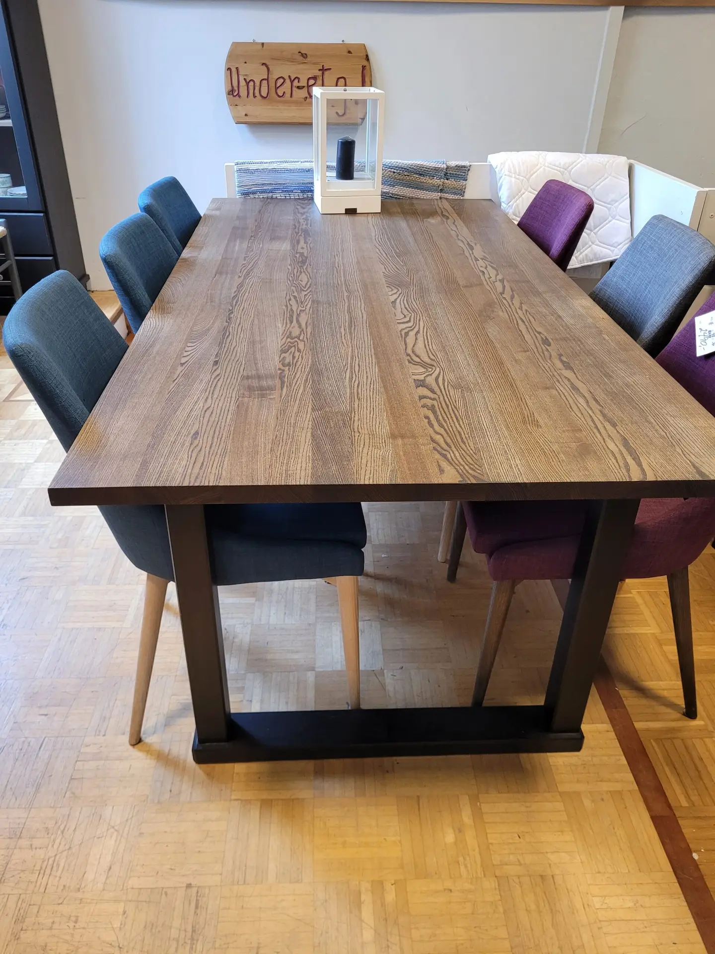 Et spesial laget bord med bordplate fra Kristensen og malt understell. Bordplaten er i oljet Ask, med en varm og fin glød. Her kan man sitte i mange timer, med god plass til 8 personer.