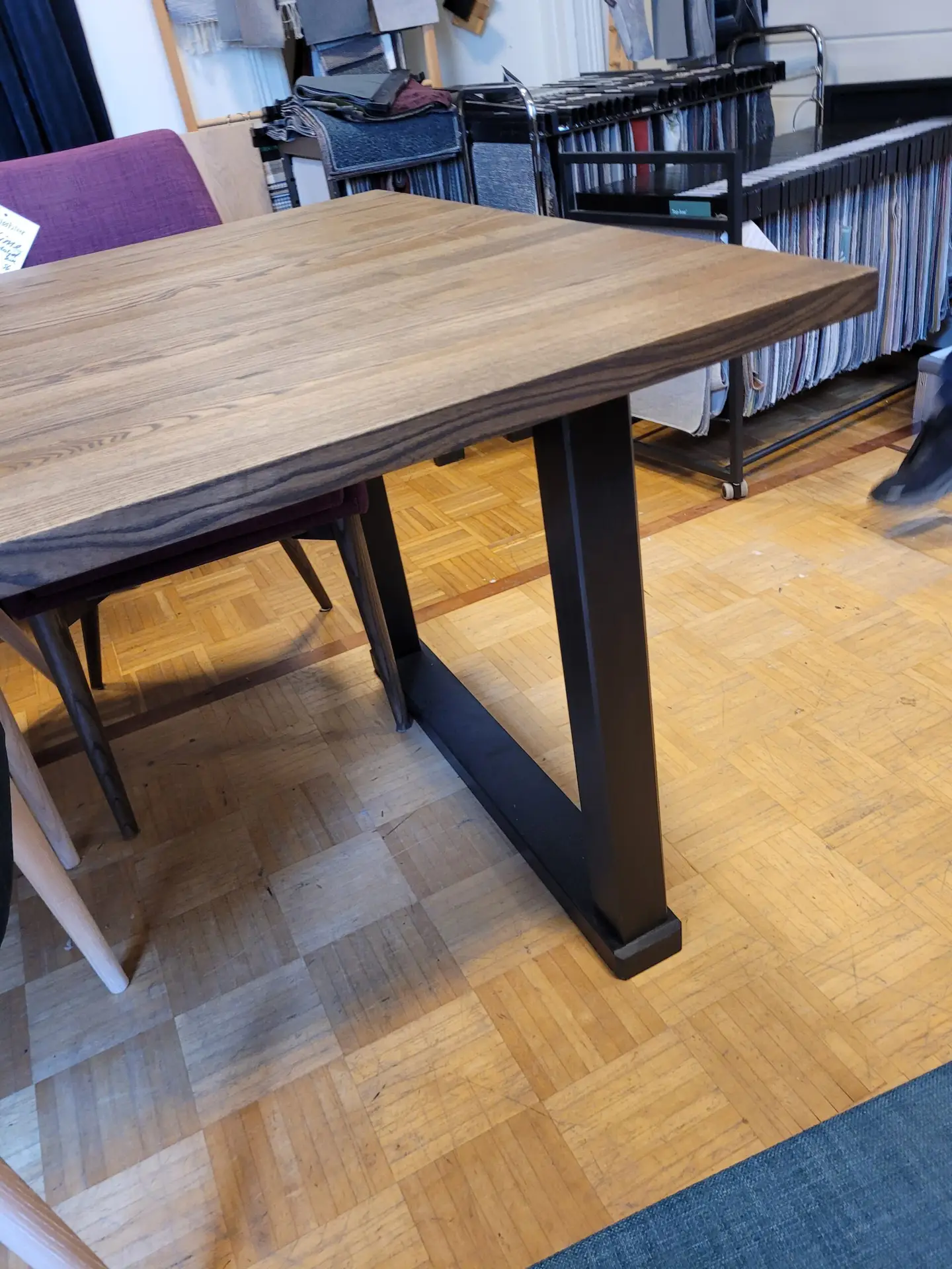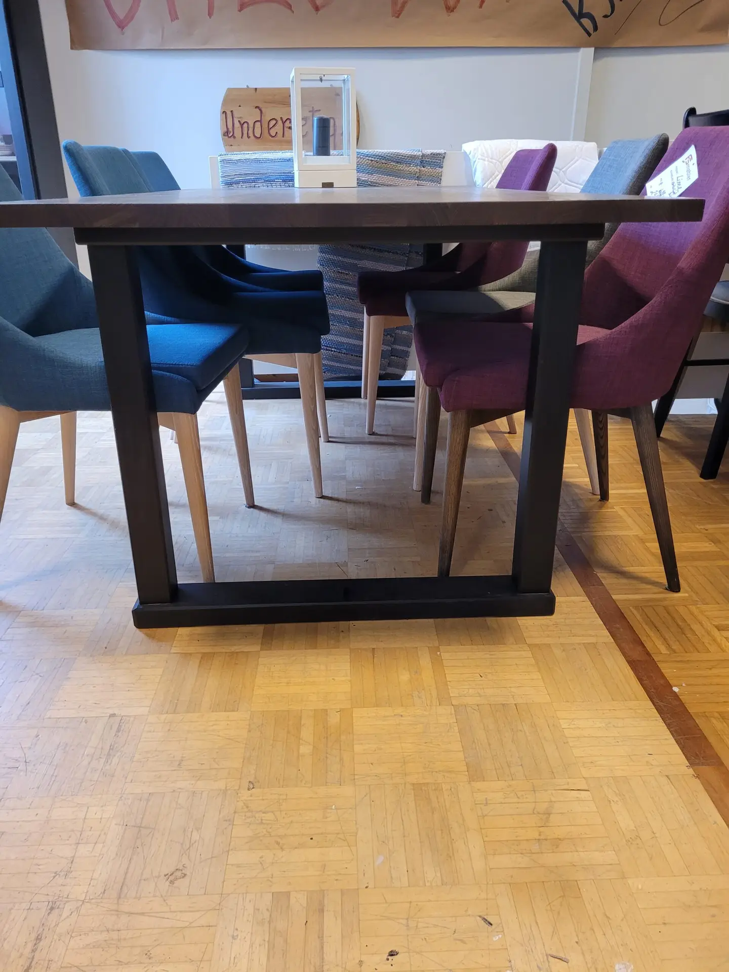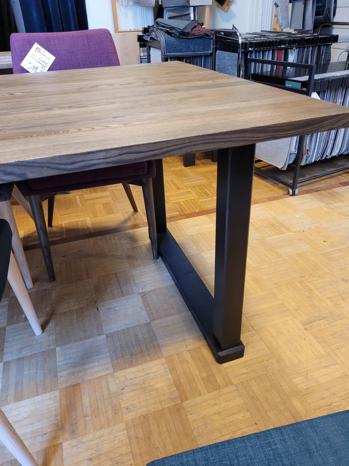 Et spesial laget bord med bordplate fra Kristensen og malt understell. Bordplaten er i oljet Ask, med en varm og fin glød. Her kan man sitte i mange timer, med god plass til 8 personer.